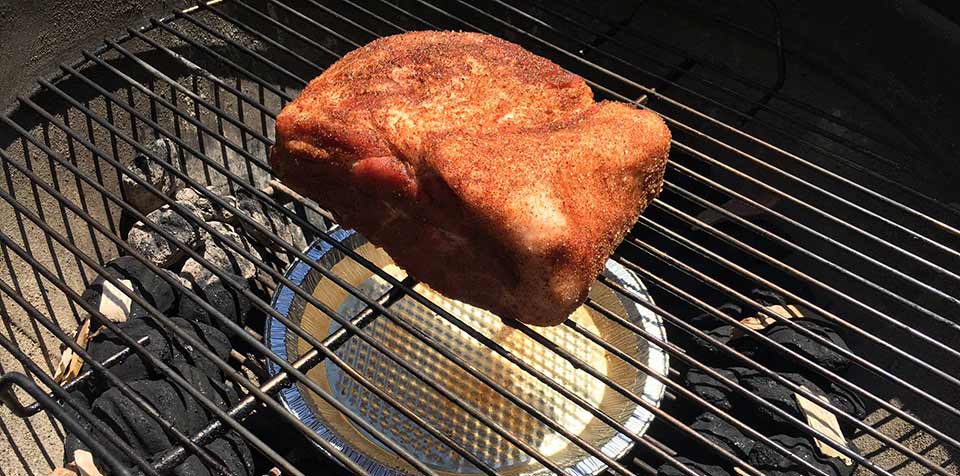 В центр решётки ставится лоток с водой. Он поможет поддерживать стабильную температуру, а так же сюда будут капать и собираться соки с куска мяса, не загрязняя гриль. Опционально, если вы хотите закоптить блюдо, добавляется щепа. Известно, что мясо впитывает большего всего ароматного дыма в начале приготовления, поэтому закономерно положить щепу к углям, с которых будет начинаться розжиг. Лучшего всего сделать пару-тройку маленьких отдельных кучек. Опилки сгорают быстрее углей, поэтому не стоит выкладывать их в сплошной ряд.
